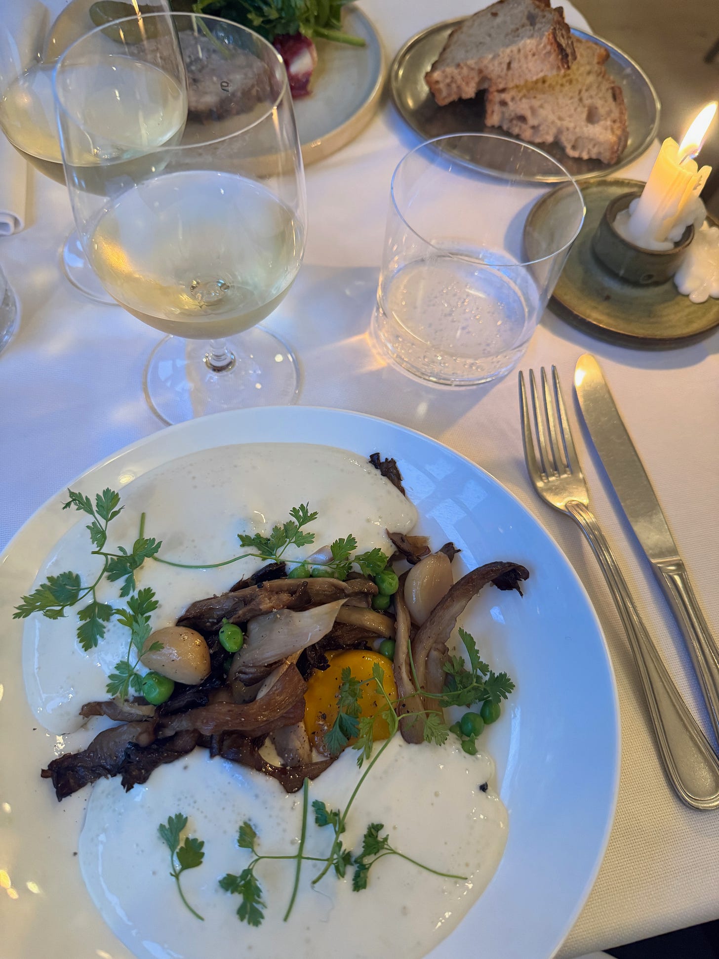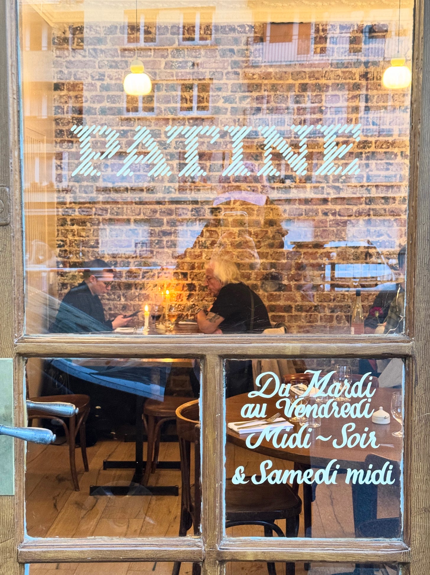 Café Mirabelle heeft inmiddels haar deuren gesloten en sinds eind vorig jaar zit op dit adres Patine, gerund door Emma Rajaud en Julien Chevallier (voormalig chef van Parcelles). Bij Patine krijgen klassieke bistrogerechten een frisse draai. De kaart is klein, maar afwisselend en je kunt er neerstrijken voor lunch (entrée + plat voor €22,-) of dîner (entrée + plat + dessert voor €50,-). Twee weken geleden reserveerde ik een tafel voor mij en een ex-collega, ook al van diezelfde tech-startup, en dat was een goed idee.